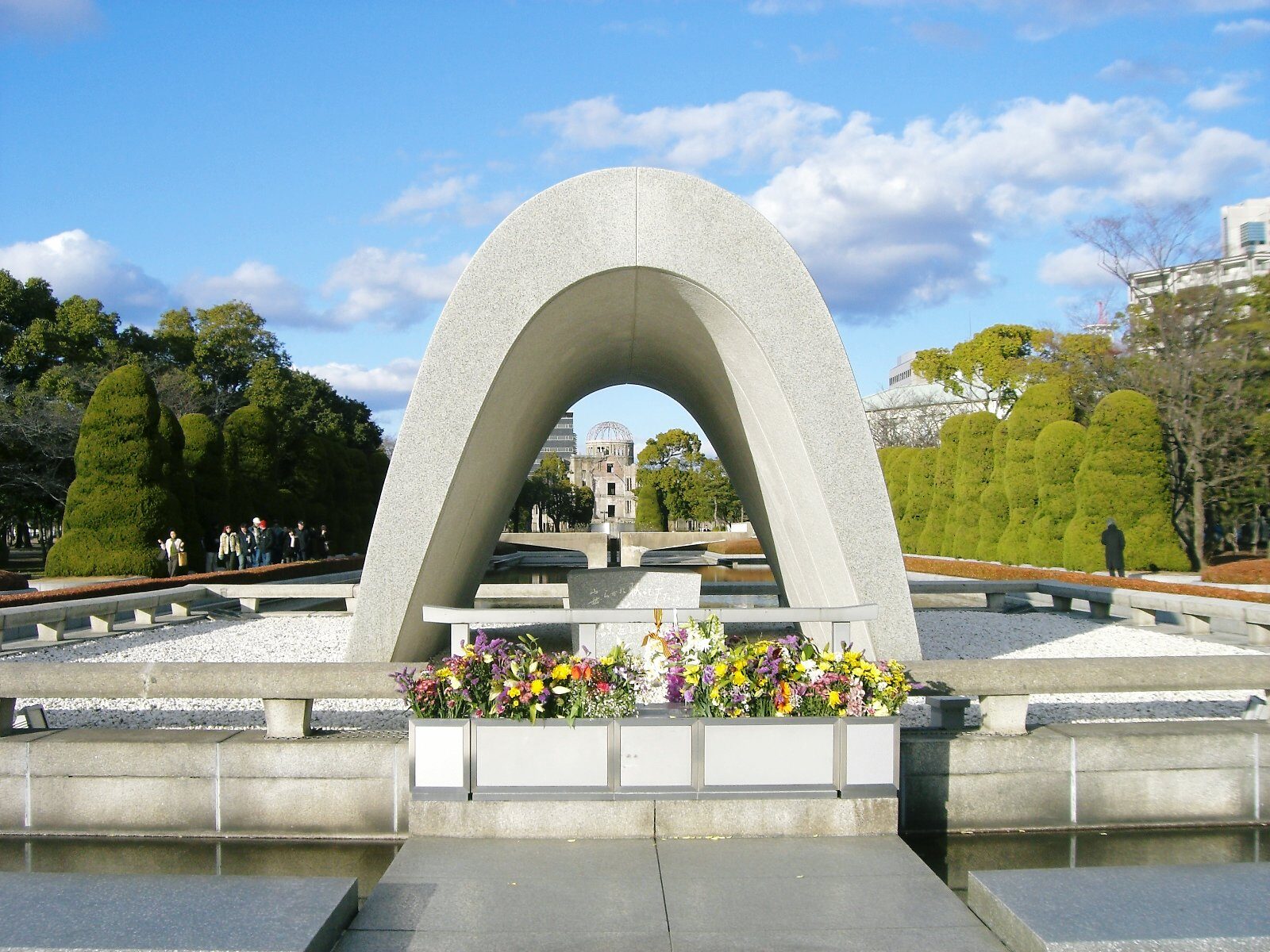 公園の中央にある「原爆死没者慰霊碑」には、「安らかに眠って下さい 過ちは繰返しませぬから」という文字が刻まれています。この言葉は、日本だけでなく、世界へ向けた強い平和のメッセージです。
