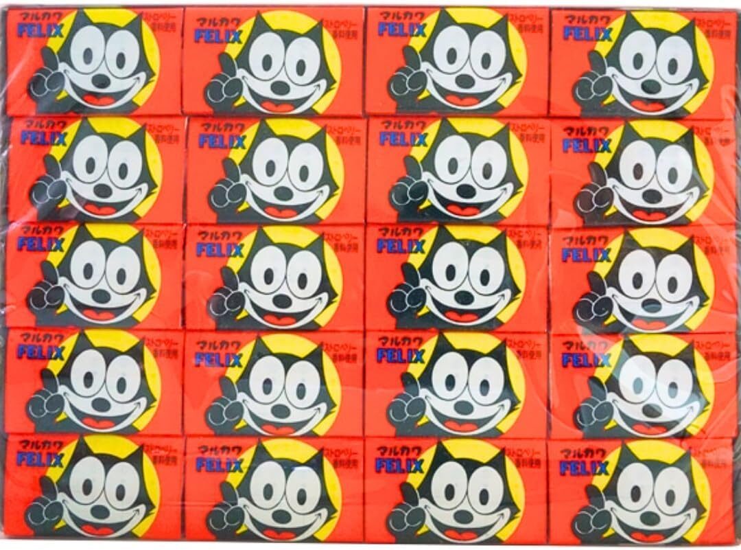 猫のキャラクター「フィリックス」が描かれたパッケージが印象的。ほんの一瞬で味が消えるその潔さも昭和らしさの象徴です。