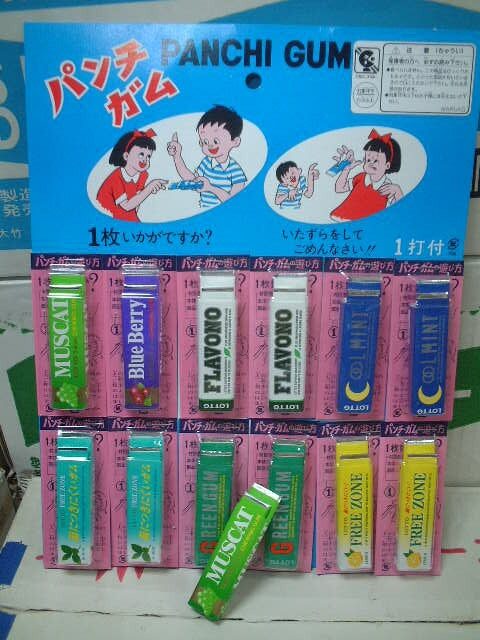ガムの形をしたイタズラおもちゃです。パッチンと指を挟むところから「パッチンガム」とも呼ばれていました。構造はいたって簡単で板ガムにセットされているバネ仕掛けの鉄製バーを折り返して、パッケージ内に装填しているだけです。「一枚食べます?」と相手に差出して、相手がガムを取った瞬間、パチン!と音がして指がバネに挟まれてしまうという仕組み。爪の真ん中など、当たり所によってはかなり痛いです。